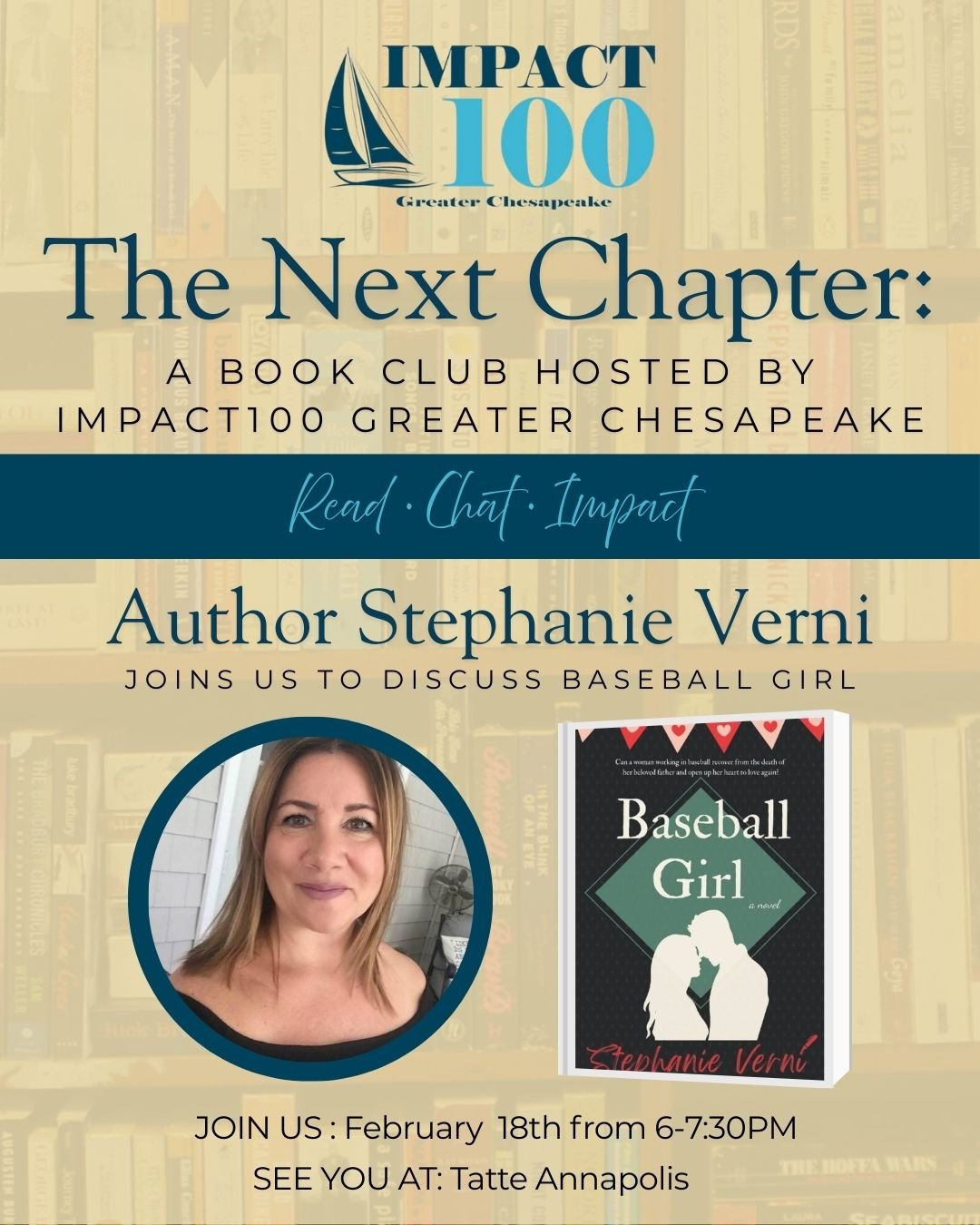 Join "The Next Chapter," Impact100 Greater Chesapeake's book club, for an unforgettable evening with author Stephanie Verni as we dive into the captivating world of "Baseball Girl." π Experience a story of passion, resilience, and the love of the game through the eyes of Verni's compelling characters.
